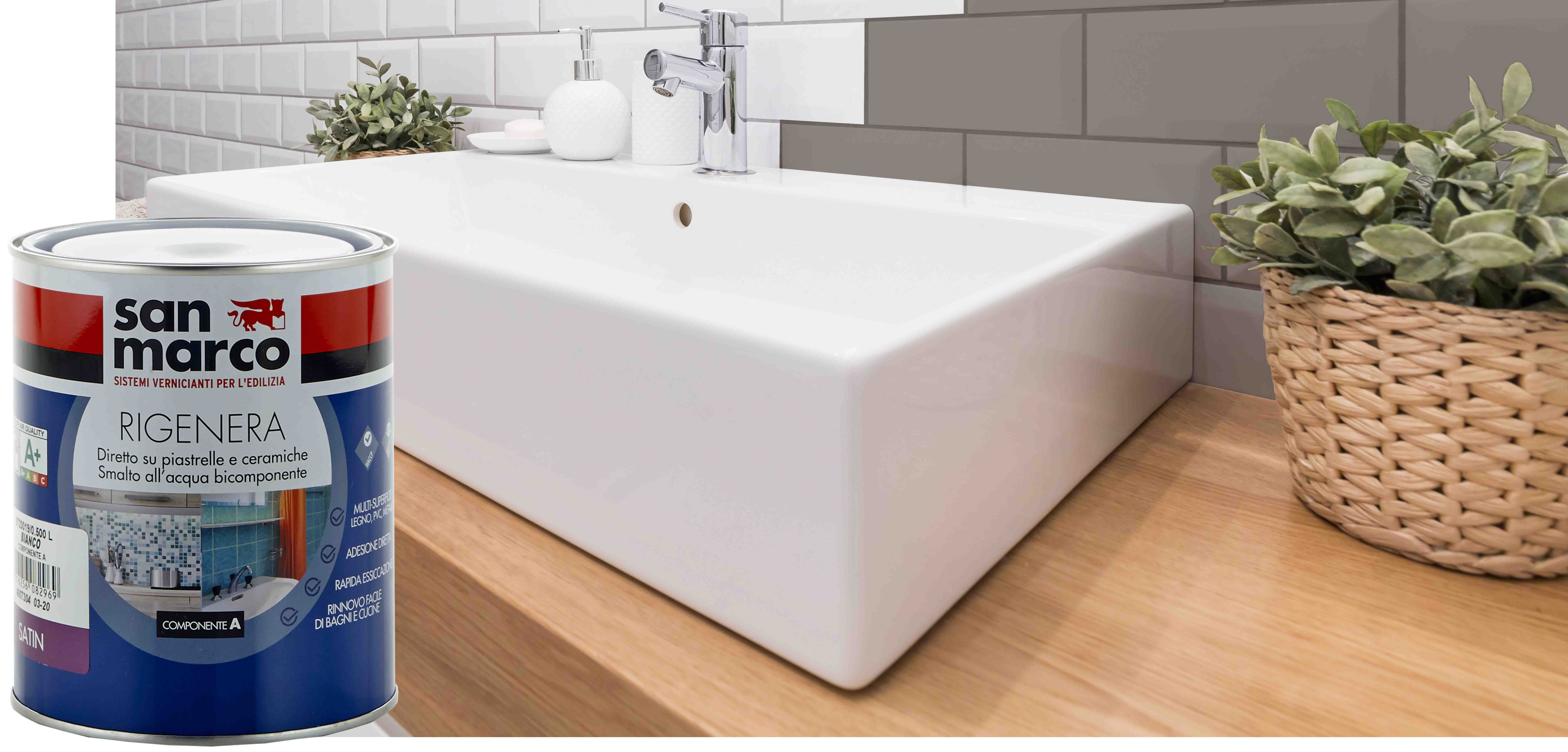 To quickly renovate your tiles, avoiding masonry work and saving money, introducing Rigenera: our simple and effective solution to renovate your rooms quickly and easily. Rigenera is our water-based tile enamel that requires no specific surface preparation and is extremely durable. Rigenera comes in two components, Component A and Component B, to be mixed before use.Available with a satin or semi-gloss effect, Rigenera creates finishes that are resistant to impacts, scratches and chemicals from common household cleaners. Choose from a broad and full range of light, pastel, bright and darker colours, regenerate the look of your surfaces and modernize rooms such as bathrooms and kitchens in no time and without invasive works.